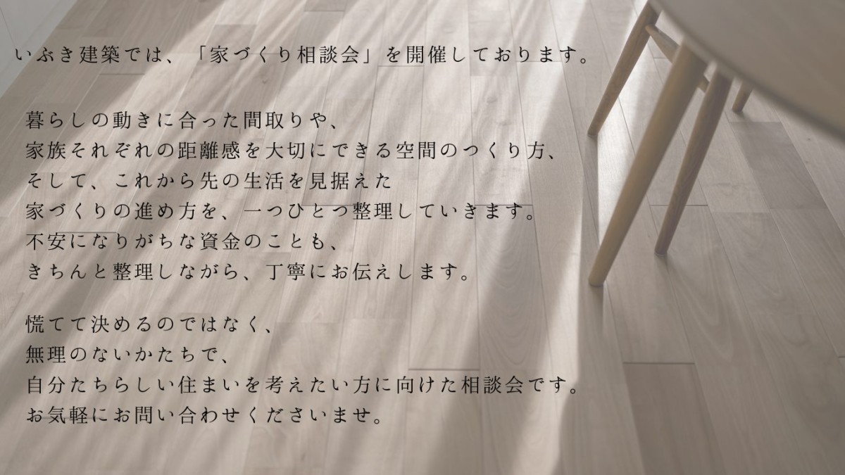 イベント・ニュースEVENT & NEWS ホームイベント・ニュース家づくり相談会開催中 家づくり相談会開催中 https://ibukikenchiku.info/soudankai/ ↑こちらからお問い合わせください。 posted at 2026.01.29 記事一覧へ戻る INSTAGRAM インスタグラム 静けさの屋根の下 やさしい距離感で暮らす #ルームツアー 『 あらゆる高度な技術 機能美 デザイ 窓から景色を楽しむ住まい #ルームツアー 『 あらゆる高度な技術 機能美 デザイン 』 礎には高 通り土間が出迎える家 #ルームツアー 『 あらゆる高度な技術 機能美 デザイン 』 礎には高い技 グレー調でまとめた心落ち着くデザイン #ルームツアー 『 あらゆる高度な技術 機能美 デザイン . 「時を重ねるほど、美しさが息づく住まいを。」 いぶき建築が目指すのは、 暮らすほどに味わいが深 素材やかたちで印象が変わる、洗面空間。 真似したい洗面台集めました。 #洗面台 『 あらゆる高度 仕事も趣味も心地よく。 さまざまなワークスペースを集めました。 #ワークスペース 『 あらゆる高 2つのお店が融合した店舗ツアー 『 あらゆる高度な技術 機能美 デザイン 』 礎には高い技術力。 静けさの屋根の下 やさしい距離感で暮らす #ルームツアー 『 あらゆる高度な技術 機能美 デザイ Instagramでフォローする