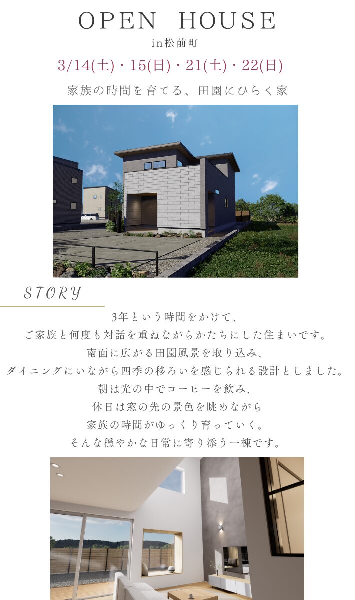 イベント・ニュースEVENT & NEWS ホームイベント・ニュース【3月完成見学会】家族の時間を育てる、田園にひらく家 【3月完成見学会】家族の時間を育てる、田園にひらく家 完成見学会予約フォーム お名前必須 お電話番号必須 - - メールアドレス必須 希望日時必須 3月14日(土)11:00〜 3月14日(土)13:00〜 3月14日(土)15:00〜 3月14日(土)17:00〜 3月15日(日)11:00〜 3月15日(日)13:00〜 3月15日(日)15:00〜 3月15日(日)17:00〜 3月21日(土)11:00〜 3月21日(土)13:00〜 3月21日(土)15:00〜 3月21日(土)17:00〜 3月22日(日)11:00〜 3月22日(日)13:00〜 3月22日(日)15:00〜 3月22日(日)17:00〜 ご来場人数必須 大人 - 1名 2名 3名 4名 5名 子供 - 1名 2名 3名 4名 5名 保育担当がお子様を見守ります。来場されるお子様のご年齢を入力してください。 ご希望の連絡方法 メール お電話 備考欄 個人情報保護方針への同意必須 同意する 「プライバシーポリシー」をご確認の上、同意するにチェックを入れて先にお進みください。 このサイトはreCAPTCHAによって保護されており、Googleのプライバシーポリシーと利用規約が適用されます。 posted at 2026.02.04 記事一覧へ戻る INSTAGRAM インスタグラム それぞれの時間が寄り添う家 #ルームツアー 『 あらゆる高度な技術 機能美 デザイン 』 礎には 無駄を削ぎ落とした、機能美ある家事動線。 動きやすさとデザイン、どちらも妥協しない一邸。 #家事動 繊細で美しい和モダンのお家 #ルームツアー 『 あらゆる高度な技術 機能美 デザイン 』 礎には 重厚感のある外壁にスタイリッシュな玄関がベストな組み合わせの住まい #ルームツアー 『 あらゆ 暮らしの中に、空と光を包み込む邸宅。 #ルームツアー 『 あらゆる高度な技術 機能美 デザイン 保存版! 是非参考にしたい洗面台集めました。 #洗面台 『 あらゆる高度な技術 機能美 デザイン 上質なホテルのような暮らしを日常に。 #ルームツアー 『 あらゆる高度な技術 機能美 デザイン 静けさの屋根の下 やさしい距離感で暮らす #ルームツアー 『 あらゆる高度な技術 機能美 デザイ 窓から景色を楽しむ住まい #ルームツアー 『 あらゆる高度な技術 機能美 デザイン 』 礎には高 Instagramでフォローする