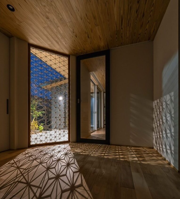 玄関で出迎えるのは、光と影のアートを描き出す「組子」の建具。