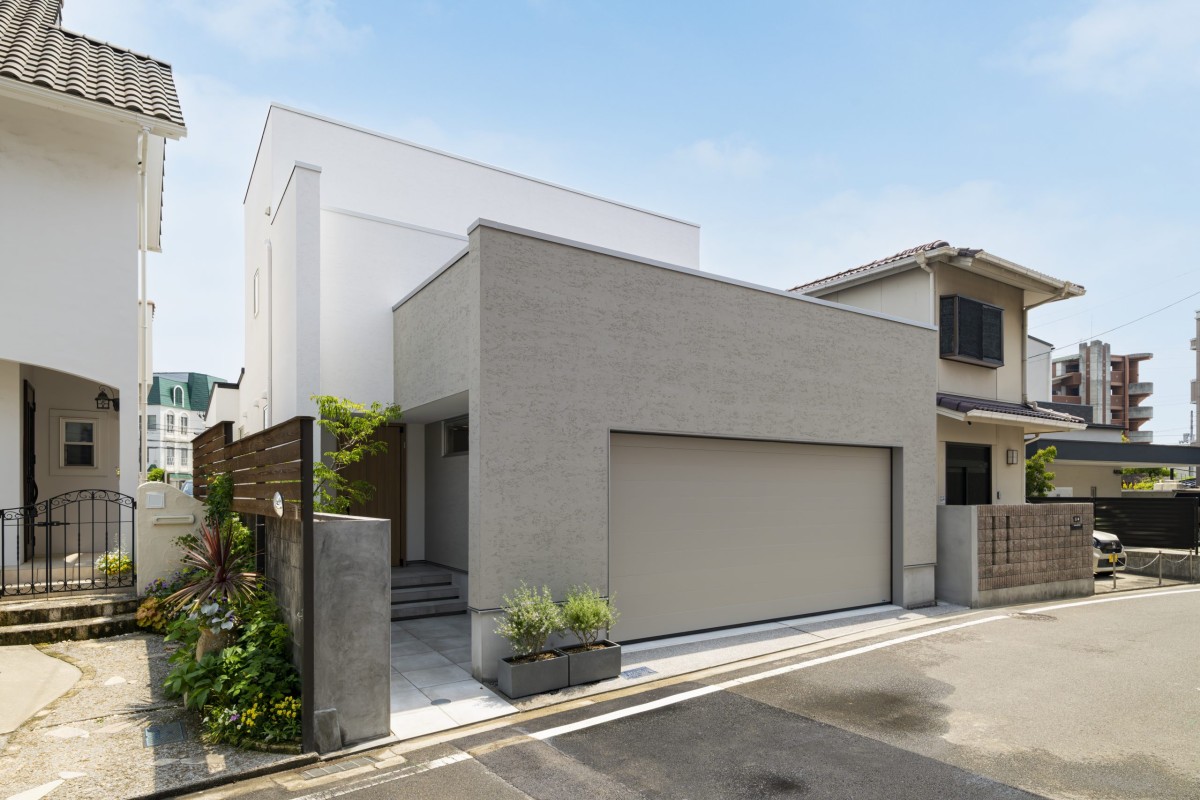 松山市の街並みに溶け込む、直線を基調としたモダンな外観。